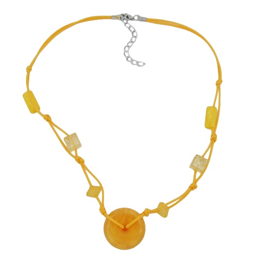 Dekoratives Modeschmuck-Collier im sommerlichen Gelb mit einer wunderschönen gelb-seidig-marmorierten glänzenden Kunststoffperle in der Mitte. Die 30x11mm große Perle Scheibe Rad wurde kunstvoll eingeknotet mit diversen anderen gelb-transparenten Kunststoffperlen in eine doppelte lüstrierte (gewachste) gelbe 0,6mm-Baumwollkordel und wird mit einem silberfarbenen Karabiner plus Verlängerungskettchen aus eloxiertem Aluminium geschlossen. Die helle freundliche sonnengelbe Farbe passt gut zur Frühlings- und Sommermode und fällt auch gut als Kontrast bei dunkler Kleidung auf. Alle Bestandteile dieser Modeschmuck-Kette wurden in Deutschland produziert und die Kette selbst in Handarbeit - made in germany - fertiggestellt.