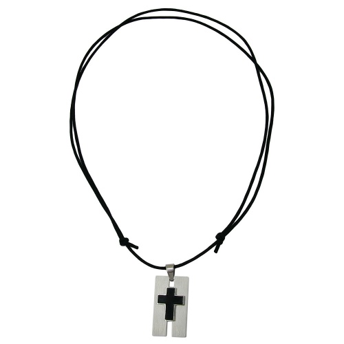 Vortrefflicher Edelstahl-Schmuck für die Herren der Schöpfung! Der Edelstahl-Anhänger mit dem schwarz emaillierten Kreuz hängt an einer 1mm dünnen, schwarzen Baumwollkordel, die einen verstellbaren Schiebeknoten zum Regulieren der Länge von 50cm bis 90cm besitzt. Ein echter Blickfang ist der Kontrast der schwarz glänzenden Emaillefläche vom 16x19mm großen, aufgesetzten Kreuz zu der mattierten Stahlplatte. Der viereckige Herrenschmuck-Anhänger aus einer 35x20x3mm großen, mittig geschlitzten Edelstahlplatte, hängt an einer 5x7mm großen, glänzenden Anhängerschlaufe, durch die auch gern eine dickere Kette oder Kordel gezogen werden kann. Lange Ketten eignen sich gut als Pulloverketten und können ohne den Verschluss zu öffnen über den Kopf angelegt werden. Alle Bestandteile dieser Modeschmuck-Kette wurden in Deutschland produziert und die Kette selbst in Handarbeit - made in germany - fertiggestellt.