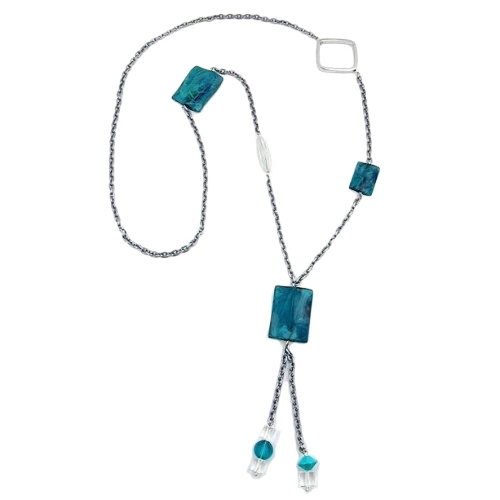 Sehr dekorative Modeschmuck-Kette in Y-Form mit baumelnden Enden, 95cm lang. Blickfang ist die 35x25mm große, türkis-marmorierte, hochwertige Kunststoffperle in der Mitte, Pillow genannt - jede Perle ist ein Unikat! - in Kombination mit türkisfarbenen, chrom- und weiß-transparenten Kunststoffperlen, gekettelt an eine 4mm dicke, grau-eloxierte Ankerkette aus Aluminium. Diese wunderschöne Kette mit den türkisfarbenen Farbtupfern unterstreicht die passenden Farben in ihrer Kleidung oder setzt zusätzliche Akzente. Lange Ketten eignen sich gut als Pulloverketten und können ohne einen Verschluss zu öffnen über den Kopf angelegt werden. Alle Bestandteile dieser Kette wurden in Deutschland produziert und die Kette selbst in Handarbeit - made in germany - fertiggestellt. Gesamtlänge: 95cm, kann bei geschicktem Umgang mit Zangen im langen Kettenteil um den Hals auch noch eingekürzt werden.