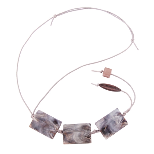 Schlichte, einfache Kordelkette, bei der die ganze Aufmerksamkeit auf den 3 wunderschönen, leicht gewellten, braun-wolfsgrau-marmorierten Viereckperlen aus hochwertigem Kunststoff - genannt Pillow-Perlen - liegt. Aufgrund ihrer Marmorierung ist jede der Perlen ein Unikat! Die schlanke (und optisch schlankmachende) Kette mit den 3 übereinander geknoteten 35x25mm großen passt gut zum naturverbundenen Kleidungsstil und zu allen erd- und naturfarbenen Kleidungsstücken. Lange Ketten ab 60cm eignen sich gut als Pulloverkette und können ohne einen Verschluss zu öffnen über den Kopf angelegt werden. Alle Bestandteile dieser metallfreien Kette wurden in Deutschland produziert und die Kette selbst in Handarbeit - made in germany - fertiggestellt.