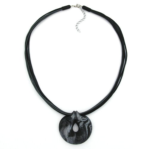 Diese wunderschöne Modeschmuck-Kette mit dem großen auffälligen Anhänger passt mit dem silbergrauen Farbton besonders gut zur Herbst- und Winterkleidung. Der 52mm große, wulstig ausgeformte Kunststoffring ist anthrazit-silber-schwarz-marmoriert und zusätzlich mattiert, jedes Teil ist durch die unterschiedliche Marmorierung ein Unikat. Durch den oberen Teil führen 4 Stränge schwarzer und 2 Stränge grauer 1mm-Baumwollkordel. Das 55cm lange Collier wird mit einem silberfarbenen Karabiner plus Verlängerungskettchen aus eloxiertem Aluminium verschlossen. Alle Bestandteile dieser Kette wurden in Deutschland produziert und die Kette selbst in Handarbeit - made in germany - fertiggestellt.