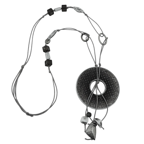 Die fantasievolle Kette mit dem 77mm großen Lochring-Anhänger aus Kunststoff, dessen beidseitiges Muster an eine genietete Metalloberfläche erinnert, ist komplett ohne Metallbestandteile gearbeitet. In Form und Farbe verschiedene grau-weiße und altsilberfarbene Kunststoffperlen wurden kunstvoll in zwei dünne graue Baumwollkordeln eingeknotet, einschließlich der vier baumelnden Enden unterhalb der auffälligen Disk-Scheibe. Die 90cm lange Kette besitzt einen verstellbaren Schiebeknoten zum Regulieren der Länge. Lange Ketten eignen sich gut als Pulloverketten und können ohne den Verschluss zu öffnen über den Kopf angelegt werden. Die rustikale Modeschmuck-Kette passt mit dem neutralen grauen Farbton besonders gut zur Jeansmode und zur Herbst- und Winterkleidung. Lange mollige Kleider und farbige Oberteile bekommen mit dieser auffälligen Kette das schmückende Extra. Alle Bestandteile dieser Kette wurden in Deutschland produziert und die Kette in Handarbeit - made in germany - fertiggestellt.