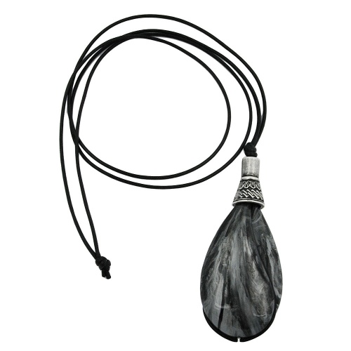 Der Anhänger dieser Kette erinnert an Kastagnetten und ist mit seiner silbergrau marmoriert glänzenden Farbe absolut alltagstauglich und komplettiert jedes feminine Oberteil aus voluminösen Stoffen, passt aber auch perfekt zu leichten Blusen oder Shirts. Der 85x36mm große, silbergrau-schwarz-marmorierte, glänzende Kunststoff-Anhänger in Tropfenform ist an einer 1mm runden, schwarzen, lüstrierten (gewachsten) Baumwollkordel befestigt. Die Kette besitzt einen verstellbaren Schiebeknoten zum Regulieren der Länge. Lange Ketten eignen sich gut als Pulloverketten und können ohne den Verschluss zu öffnen über den Kopf angelegt werden. Farbiger Modeschmuck betont die Farben der Kleidung oder setzt zusätzliche Akzente. Alle Bestandteile dieser Kette wurden in Deutschland produziert und die Kette selbst in Handarbeit - made in germany - fertiggestellt.