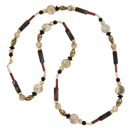 110cm lange, multi-farbige Modeschmuckkette aus hochwertigen Kunststoff-Teilen dunkelhorn und beige-marmoriert, kombiniert mit Holzperlen dunkelbraun und Kunststoffperlen goldfarbig überzogen, in Deutschland gefertigte Handarbeit