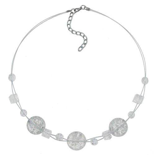 Wunderschönes Drahtcollier in der neutralen wie festlichen Farbe Weiß mit einem drei Scheiben aus Kunststoff als besonderen Blickfang. Die 28mm großen flachen Scheiben sind auf der Vorderseite durchsichtig transparent mit Flitter und auf der körnigen Rückseite wachsweißfarben. Kombiniert mit transparenten Kunststoffwürfeln und facettierten Perlen wurden sie doppelt aufgezogen auf weißen kunststoffummantelten Edelstahldraht mit silberfarbenem Karabiner-Verschluss plus Verlängerungskettchen aus eloxiertem Aluminium. Alle Bestandteile dieser Modeschmuck-Kette wurden in Deutschland produziert und die Kette selbst in Handarbeit - made in germany - fertiggestellt.