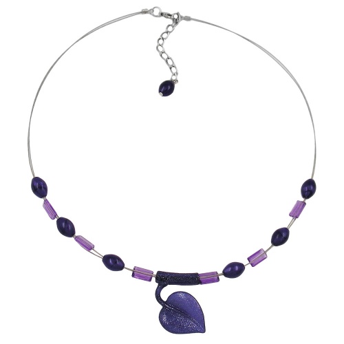 Wunderschönes Drahtcollier mit einer 28x20mm großen, dunkellila-flitterbedeckten Kunststoff-Perle in Blattform, passend zum Trend der floralen Mode und als modisches Highlight zu farbenprächtigen Oberteilen. Das einzelne Blatt am Rohr ist Ton-in-Ton kombiniert mit kleinen Oliven und facettierten Kunststoff-Perlen in lila-flitter und lila-transparent, doppelt aufgezogen auf kunststoffummantelten Edelstahldraht mit silberfarbenem Karabiner-Verschluss plus Verlängerungskettchen aus eloxiertem Aluminium und einer Perle als Abschluss. Alle Bestandteile dieser Modeschmuck-Kette wurden in Deutschland produziert und die Kette selbst in Handarbeit - made in germany - fertiggestellt.