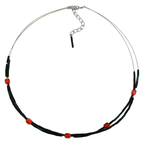Zierliches Drahtcollier mit dunkelblauen Glasstiften mit schimmerndem Aurora-Borealis-Effekt, kombiniert mit rot-transparenten Glaswürfeln, doppelt aufgezogen auf kunststoffummantelten Edelstahldraht mit silberfarbenem Karabiner-Verschluss plus Verlängerungskettchen aus eloxiertem Aluminium. Alle Bestandteile dieser Kette wurden in Deutschland produziert und die Kette selbst in Handarbeit - made in germany - fertiggestellt.
