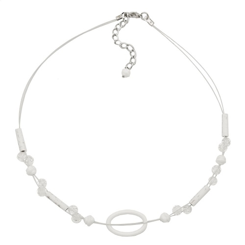 Kunststoffperlen weiß und Schliffperlen transparent, Ring weiß oval 15x24mm auf 2-fach Stahldraht kunststoffummantelt weiß, Verschluss silber-farbig mit Verlängerungskettchen, in Deutschland gefertigte Handarbeit