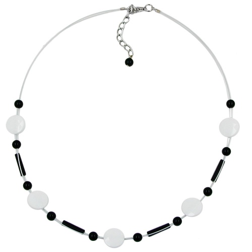 Modisches Drahtcollier im klassischen Schwarz-Weiß-Farbton, 13mm große, weiße facettierte Linsen aus Kunststoff, kombiniert mit 15x3mm großen, schwarzen Röhrchen und 5mm großen Rundperlen aus Kunststoff, doppelt aufgezogen auf weißen kunststoffummantelten Edelstahldraht mit silberfarbenem Karabiner-Verschluss plus Verlängerungskettchen aus eloxiertem Aluminium und schwarzer 5mm-Rundperle als Abschluss. Alle Bestandteile dieser Modeschmuck-Kette wurden in Deutschland produziert und die Kette selbst in Handarbeit - made in germany - fertiggestellt.