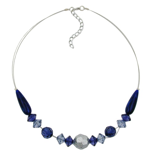 Wunderschönes Drahtcollier im kühlen Dunkelblau, passend zu Ihrem Jeans-Look. Blickfang ist die 16mm große silbern-matt-bedampfte Wabenperle in der Mitte, kombiniert mit facettierten Kunststoffperlen blau-transparent und blau-weiß-marmoriert, doppelt aufgezogen auf kunststoffummantelten Edelstahldraht mit silberfarbenem Karabiner-Verschluss plus Verlängerungskettchen aus eloxiertem Aluminium. Alle Bestandteile dieser Modeschmuck-Kette wurden in Deutschland produziert und die Kette selbst in Handarbeit - made in germany - fertiggestellt.