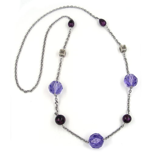 tolles Mode-Collier passend für viele Gelegenheiten, drei hochwertige facettierte Kunststoffperlen lila-transparent bilden den Mittelpunkt kombiniert mit Kunststoffperlen lila-seidig und Würfel altsilber galvanisch, an Eloxalkette Anker grau-matt, in Deutschland gefertigte Handarbeit