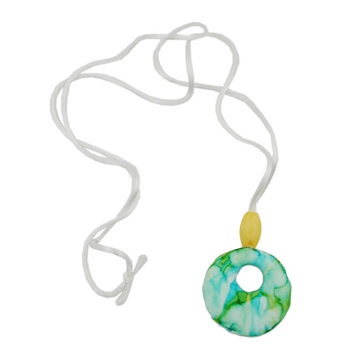 Collier mit Kunststoff-Anhänger Creole gelb-türkis-weiß-marmoriert, 40mm, an Seidenkordel weiß, in Deutschland gefertigte Handarbeit