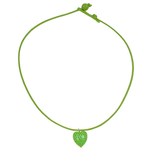 Dezente kleine Kinderkette mit apfelgrünem Herz-Anhänger, die einfach mit einer kleinen grünen Perle und einer Schlaufe zum Durchstecken verschlossen wird, ganz ohne Metall-Verschluss. An der kurzen, nur 40cm langen Kette aus dünner hellgrüner Baumwollkordel hängt das 18x14mm große, leicht bauchige, grün-seidige Herz aus Kunststoff mit einer facettierten Oberfläche. Alle Bestandteile dieser Modeschmuck-Kette wurden in Deutschland produziert und die Kette selbst in Handarbeit - made in germany - fertiggestellt.
