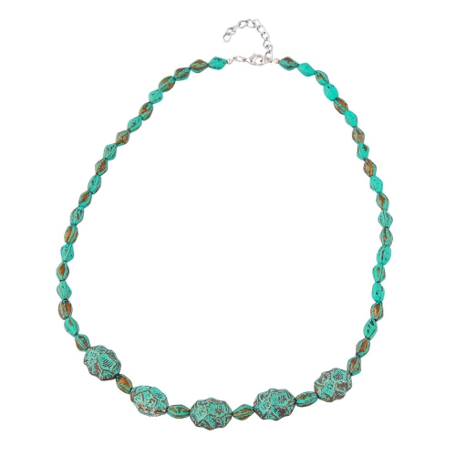 Von wegen altbacken! Dieses wunderschöne, 55cm lange Modeschmuck-Collier besticht mit dem verwitterten Charme eines historisch-wertvollen Schmuckstücks und setzt den passenden Kontrast zu langweiligen Farben in ihrer Oberbekleidung. Bei der klassisch gefädelten Perlenkette, mit den grün-türkisfarben gefärbten Kunststoffperlen mit altmessingfarbenen Patina-Effekt und silberfarbigen Verschluss mit Verlängerungskettchen, fallen außer der türkisen Farbe auch die 5 extravagant ausgeformten, 19x15mm großen Kroko-Perlen in der Mitte auf. Alle Bestandteile dieser Modeschmuck-Kette wurden in Deutschland produziert und die Kette selbst in Handarbeit - made in germany - fertiggestellt.