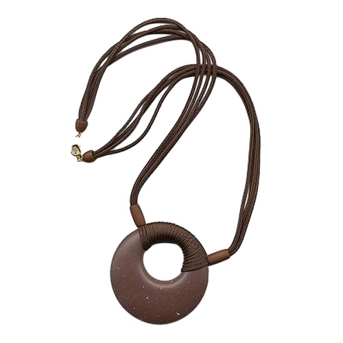 Diese zeitlos schöne Modeschmuck-Kette mit dem dekorativen 65mm großen amulettähnlichen Anhänger passt gut zu allen erd- und naturfarbenen Kleidungsstücken und komplettiert wunderbar die Herbst- und Wintermode. Die dunkelbraune, einseitig leicht gewölbte flache Kunststoff-Scheibe mit den kleinen beigefarbenen Farbpünktchen ist mit 4 Strängen von dunkelbrauner Textilkordel umwickelt und hängt dadurch schön breit im Dekolleté. Das 63cm lange Collier wird mit einem goldfarbenen Karabiner verschlossen. Farbiger Modeschmuck betont die Farben der Kleidung oder setzt zusätzliche Akzente. Alle Bestandteile dieser Kette wurden in Deutschland produziert und die Kette in Handarbeit - made in germany - fertiggestellt.