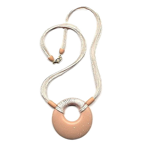 Diese zeitlos schöne Modeschmuck-Kette mit dem dekorativen 65mm großen amulettähnlichen Anhänger passt gut zu allen hellen naturfarbenen Kleidungsstücken und komplettiert wunderbar die Frühlings- und Sommermode. Die apricotfarbene, einseitig leicht gewölbte flache Kunststoff-Scheibe mit den kleinen beigefarbenen Farbpünktchen ist mit 4 Strängen hellrosafarbener Textilkordel umwickelt und hängt dadurch schön breit im Dekolleté. Das 60cm lange Collier wird mit einem goldfarbenen Karabiner verschlossen. Farbiger Modeschmuck betont die Farben der Kleidung oder setzt zusätzliche Akzente. Alle Bestandteile dieser Kette wurden in Deutschland produziert und die Kette in Handarbeit - made in germany - fertiggestellt.