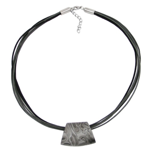 Diese zeitlos schöne Modeschmuck-Kette mit der prächtigen Einzelperle passt gut zu allen grauen und schwarzen Kleidungsstücken. Die Farben silbergrau und schwarz sind bei dem bauchig gewölbten 38x27x18mm großen glänzenden Anhänger wunderschön miteinander vermischt (marmoriert) und jeder Anhänger ist ein Unikat, einzigartig im Aussehen. Durch die hochwertige Kunststoffperle führen 6 Stränge 0,6mm-Baumwollkordel, 4x grau und 2x schwarz, und das 45cm lange Collier wird mit einem silberfarbenen Karabiner plus Verlängerungskettchen aus eloxiertem Aluminium verschlossen. Farbiger Modeschmuck betont die Farben der Kleidung oder setzt zusätzliche Akzente. Alle Bestandteile dieser Kette wurden in Deutschland produziert und die Kette selbst in Handarbeit - made in germany - fertiggestellt.