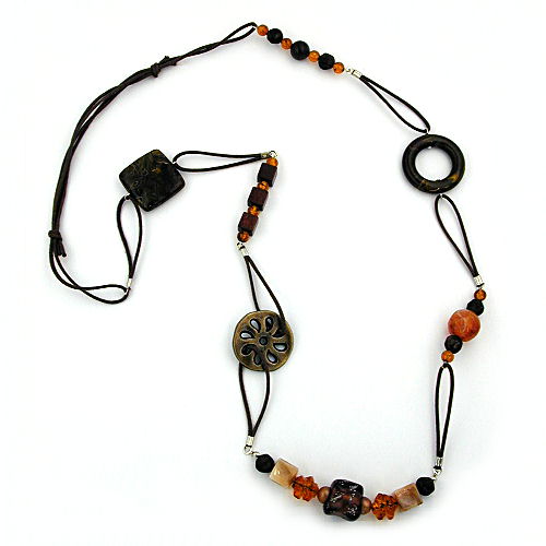 Bei dieser raffinierten Halskette in braun gehaltenen dunklen Herbsttönen wurden einzelne Mustersätze mit dekorativen Kunststoffperlen kunstvoll mit Abschnitten von brauner Baumwollkordel verbunden. Die abwechslungsreichen Mustersätze wurden mit unterschiedlichen Kunststoff-Perlen in bernsteinfarben, dunkelbraun und beige-marmoriert geschmackvoll kombiniert. Ein besonderer Blickfang ist die asymmetrische Aufteilung, in der das braun-marmorierte, 25x25mm große Kunststoff-Viereck, der ebenfalls braun-marmorierte, 30mm große Ring und die schöne, in altmessingfarben galvanisierte, 29mm große Rosette hervorsticht. Die lange Pulloverkette kann mit dem verstellbaren Schiebeknoten auf Wunschlänge zwischen 85cm bis 100cm reguliert werden. Alle Bestandteile dieser wunderschönen Modeschmuck-Kette wurden in Deutschland produziert und die Kette selbst in Handarbeit - made in germany - fertiggestellt. Diese extravagante lange Halskette ist das passende i-Tüpfelchen und wunderbares Accessoire für Herbst- und Wintermode.