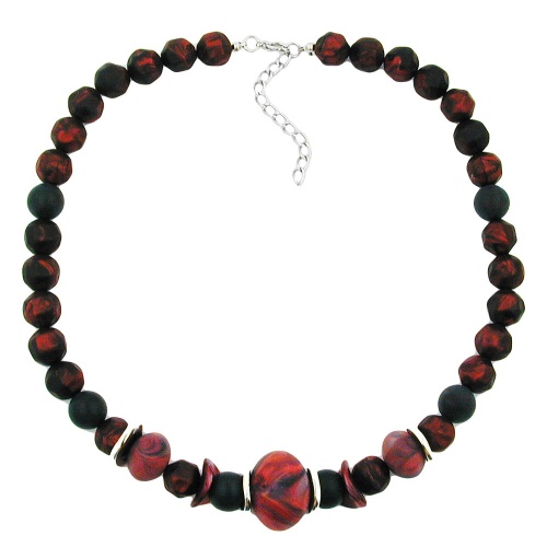 Dieses wunderschöne flammende schwarz-rote Collier für modebewusste Damen vereint hochwertige Kunststoffperlen in ausgefallenen Formen und Farbvariationen und komplettiert hervorragend die Herbst- und Wintermode. Einen besonderen Blickfang der 48cm langen, gefädelten Perlenkette bildet der opulente Mustersatz in der Mitte der rot-marmorierten und schwarzen Perlen. Die Kette wird mit einem stabilen silberfarbenen Karabiner mit Verlängerungskettchen geschlossen. Alle Bestandteile dieser Modeschmuck-Kette wurden in Deutschland produziert und die Kette selbst in Handarbeit - made in germany - fertiggestellt. Farbiger Schmuck betont die Farben der Kleidung oder setzt zusätzliche Akzente.