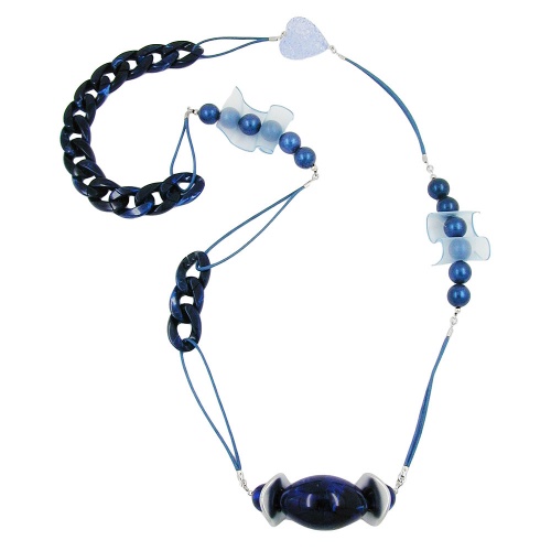 Sehr dekorative, 90cm lange Modeschmuck-Kette im trendigen Materialmix für die modebewusste Trägerin! Die abwechslungsreichen Mustersätze, teilweise gefädelt, mit hochwertigen blauen Kunststoffperlen in Kombination mit matten silberfarbenen Zwischenteilen oder hellblauen textilen Organza-Schlaufen, sind kunstvoll mit einer doppelten 1mm dicken dunkelblauen Baumwollkordel verbunden. Ein Teil der Kette besteht aus blauen Panzerkettengliedern aus Kunststoff, die geschmeidig am Hals anliegen. Lange Ketten ab 60cm eignen sich gut als Pulloverkette und können ohne den Verschluss zu öffnen über den Kopf angelegt werden. Die aufwendig hergestellte Kette passt zur farblich abgestimmten Kleidung genauso gut wie zum sportlichen Jeanslook. Alle Bestandteile dieser Kette wurden in Deutschland produziert und die Kette selbst in Handarbeit - made in germany - fertiggestellt.
