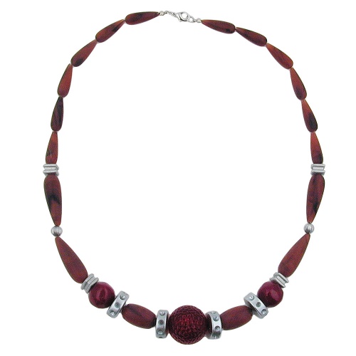 Dieses wunderschöne Collier in dunklen Rot- und Brauntönen passt hervorragend zur kuschelig warmen Mode in der kalten Jahreszeit (entgegengesetzte Aussage zum Bild mit der Schaufensterpuppe). Die harmonisch gefädelte, 55cm lange Modeschmuckkette kombiniert hochwertige Kunststoffperlen in schokobraun-marmoriert und bordeaux-marmoriert mit altsilberfarbenen Zwischenperlen, den Blickfang bildet eine 21mm große rot-transparente Schmuckperle in der Mitte. Die Kette wird mit einem silberfarbenen Karabiner geschlossen. Alle Bestandteile dieser Modeschmuck-Kette wurden in Deutschland produziert und die Kette selbst in Handarbeit - made in germany - fertiggestellt. Farbiger Schmuck für die modebewusste Dame betont die Farben der Kleidung oder setzt zusätzliche Akzente.