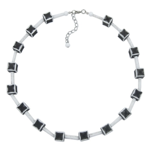 Bei diesem zeitlos schönen Modeschmuck-Collier im klassischen Schwarz-Weiß-Stil wurden 10x10mm große schwarz-weiß-schattierte Würfel abwechselnd mit schlanken 15x3mm großen weiß-strukturierten Röhrchen aus Kunststoff auf 42cm Länge gefädelt und mit einem silberfarbenen Karabiner plus Verlängerungskettchen aus eloxiertem Aluminium verschlossen. Alle Bestandteile dieser Modeschmuck-Kette wurden in Deutschland produziert und die Kette selbst in Handarbeit - made in germany - fertiggestellt. Diese kurze Halskette ist das passende i-Tüpfelchen und wunderschönes Accessoire für Ihre Basismode.