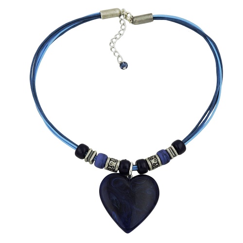 Diese wunderschöne blaue Halskette mit dem großen Herz-Anhänger ist ein echter Blickfang für s Dekolleté. Das auffallend große dunkelblau-marmorierte 40x40mm-Herz aus hochwertigem Kunststoff ist mit weiteren blauen und altsilberfarbenen Kunststoffperlen auf eine 5-fache (3x blau und 2x hellblau) 0,6mm-Baumwollkordel aufgezogen und mit einem silberfarbener Karabiner-Verschluss plus Verlängerungskettchen aus eloxiertem Aluminium und einer kleinen passenden Perle als Abschluss geschlossen. Die farbige Modeschmuck-Kette passt gut zum Landhaus-Stil und zur Trachtenmode, kann aber auch zum Jeanslook und zu anderer blauer Kleidung getragen werden. Alle Bestandteile dieser Kette wurden in Deutschland produziert und die Kette selbst in Handarbeit - made in germany - fertiggestellt.
