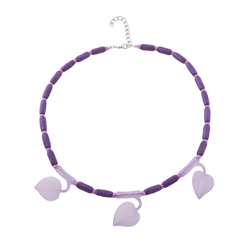 Wunderschöne kurze Halskette mit drei auffallend großen, zartlila-transparenten matten Kunststoff-Perlen in Blattform, passend zum Trend der floralen Mode und als modisches Highlight zu farbenprächtigen Oberteilen. Die 28x20mm großen Blätter sind Ton-in-Ton kombiniert mit kleinen dunklen Barock-Röhren-Perlen und fliederfarbenen runden Zwischenperlen aus Kunststoff. Die 45cm lange Kette wird mit einem silberfarbenen Karabiner plus Verlängerungskettchen aus eloxiertem Aluminium geschlossen. Alle Bestandteile dieser Modeschmuck-Kette wurden in Deutschland produziert und die Kette selbst in Handarbeit - made in germany - fertiggestellt.
