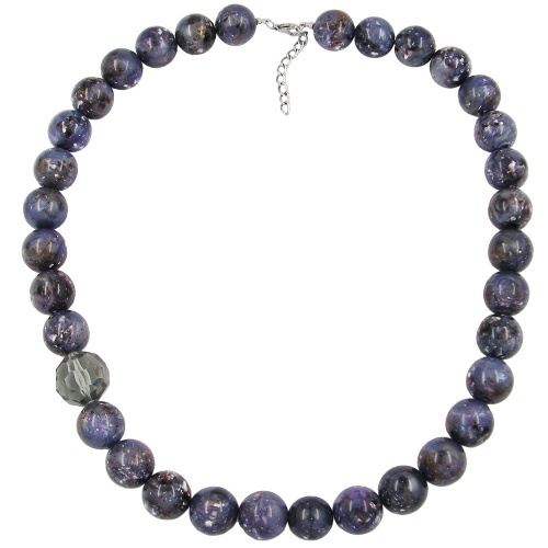 dekoratives Collier mit 18mm Kunststoffperle grau-lila-weiß-marmoriert glänzend, Blickfang bildet eine 20mm Kunststoffperle grau-transparent und facettiert, Verschluss silber-farbig mit Verlängerungskettchen, in Deutschland gefertigte Handarbeit