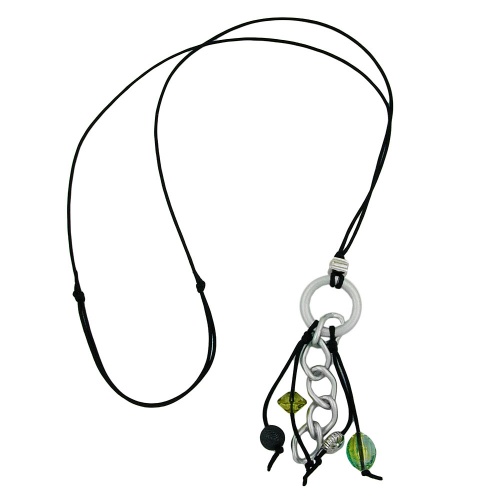 Diese flippige locker leichte Y-Kette setzt mit ihren kleinen grün-blauen Farbtupfern dezente farbige Akzente. Der ca. 10cm lange Y-Behang ist an einer einfachen schwarzen Baumwollkordel befestigt, Gesamtlänge 80cm, einkürzbar bis auf 40cm mittels verstellbarem Schiebeknoten. An dem 40mm großen Aluminiumring baumeln kurze schwarze Kordelenden, verziert mit verschiedenen grün-blauen Kunststoffperlen, zusammen mit großen Weitpanzer-Kettengliedern aus Aluminium. Die hippe Teenagerschmuck-Kette kann ohne den Verschluss zu öffnen über den Kopf angelegt werden. Alle Bestandteile dieser Kette wurden in Deutschland produziert und die Kette selbst in Handarbeit - made in germany - fertiggestellt.