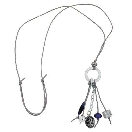 Diese flippige locker leichte Y-Kette setzt mit ihren kleinen blau-grauen Farbtupfern dezente farbige Akzente. Der ca. 10cm lange Y-Behang ist an einer einfachen grauen Baumwollkordel befestigt, Gesamtlänge 80cm, einkürzbar bis auf 40cm mittels verstellbarem Schiebeknoten. An dem 40mm großen Aluminiumring baumeln kurze graue Kordelenden, verziert mit verschiedenen grün-blauen Kunststoffperlen, zusammen mit Weitpanzer-Kettengliedern aus Aluminium, an deren Ende ein flaches ovales altsilberfarbenes Frauenbildnis (Gemme) aus Kunststoff hängt. Die hippe Teenagerschmuck-Kette kann ohne den Verschluss zu öffnen über den Kopf angelegt werden. Alle Bestandteile dieser Kette wurden in Deutschland produziert und die Kette selbst in Handarbeit - made in germany - fertiggestellt.