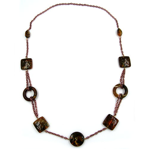 hochwertiges Mode-Collier mit großen Kunststoffteilen in braun-marmoriert, Scheibe 27mm, Ring 31mm und Viereck 25mm, kombiniert mit Aluminium-Ankerkette in kupferton, in Deutschland gefertigte Handarbeit