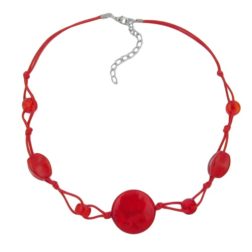 Diese Modeschmuck-Kette ist ein tolles i-Tüpfelchen zu Ihrer Sommergarderobe! hochwertige Kunststoffteile in verschiedenen Formen in korallenrot, seidig glänzend, wurden kombiniert und mit 2-fach Baumwollkordel rot verbunden, Verschluss silber-farbig mit Verlängerungskettchen, in Deutschland gefertigte Handarbeit