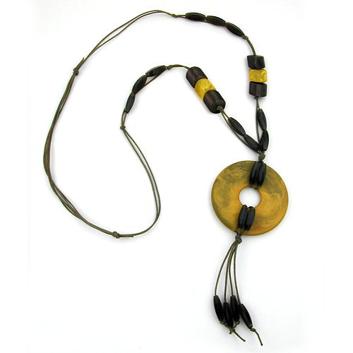 Collier passend zur aktuellen Herbst- und Wintermode, Blickfang bildet eine Kunststoff-Scheibe 58mm oliv-marmoriert matt, kombiniert mit Kunststoff-Teilen in oliv und khaki, 2-fach Kordel 0,6mm oliv, längenverstellbar mittels Schiebeknoten