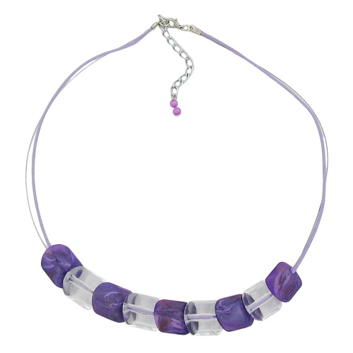 Dekoratives Modeschmuck-Collier im frischen Lila-Farbton mit einem Mustersatz aus 20x15mm großen Schrägperlen aus Kunststoff, abwechselnd flieder-marmoriert-matt und kristallklar-transparent, die sich wie Schuppen ineinander fügen, aufgezogen auf einer lüstrierten (gewachsten) hell-lilafarbenen 0,6mm-Baumwollkordel und einem doppelten, kunststoffummantelten Edelstahldraht, verbunden mit einem silberfarbenen Karabiner-Verschluss plus Verlängerungskettchen aus eloxiertem Aluminium. Der frische Farbton passt zu allen Sommerfarben und als Kontrast zu gedeckten Farben in Ihrer Kleidung. Alle Bestandteile dieser Modeschmuck-Kette wurden in Deutschland produziert und die Kette selbst in Handarbeit - made in germany - fertiggestellt.