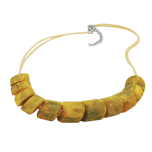 Dekoratives Modeschmuck-Collier in strahlendem Ockergelb mit einem Mustersatz aus 20x15mm großen Schrägperlen aus Kunststoff, gelb-oliv-marmoriert-matt, die sich wie Schuppen ineinander fügen, aufgezogen auf zwei lüstrierte (gewachste) hellgelbe 0,6mm-Baumwollkordeln mit silberfarbenem Karabiner-Verschluss plus Verlängerungskettchen aus eloxiertem Aluminium. Der frische Farbton passt zu allen Sommerfarben und als Kontrast zu gedeckten Farben in Ihrer Kleidung. Alle Bestandteile dieser Modeschmuck-Kette wurden in Deutschland produziert und die Kette selbst in Handarbeit - made in germany - fertiggestellt.