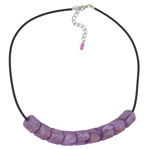 Dekoratives Modeschmuck-Collier im Lila-Farbton mit einem Mustersatz aus 20x15mm großen Schrägperlen aus Kunststoff in flieder-marmoriert-matt, die sich wie Schuppen ineinander fügen, aufgezogen auf eine schwarze 2mm-Vollgummi-Rundschnur mit silberfarbenem Karabiner-Verschluss plus Verlängerungskettchen aus eloxiertem Aluminium. Der helle Beeren-Farbton passt zu freundlichen Herbst-und Winterfarben. Alle Bestandteile dieser Modeschmuck-Kette wurden in Deutschland produziert und die Kette selbst in Handarbeit - made in germany - fertiggestellt.