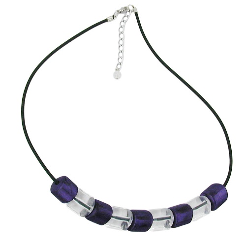 Dekoratives Modeschmuck-Collier mit einem Mustersatz aus 20x15mm großen Schrägperlen aus Kunststoff, abwechselnd lila-seidig-glänzend und kristallklar-transparent-glänzend, die sich wie Schuppen ineinander fügen, aufgezogen auf eine schwarze 2mm-Vollgummi-Rundschnur mit silberfarbenem Karabiner-Verschluss plus Verlängerungskettchen aus eloxiertem Aluminium. Der dunkle Lila-Farbton passt zu allen gedeckten Herbst-und Winterfarben. Alle Bestandteile dieser Modeschmuck-Kette wurden in Deutschland produziert und die Kette selbst in Handarbeit - made in germany - fertiggestellt.