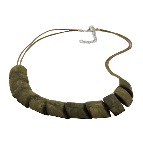 Dekoratives Modeschmuck-Collier mit einem Mustersatz aus 20x15mm großen Schrägperlen aus Kunststoff, olivgrün-marmoriert-matt, die sich wie Schuppen ineinander fügen, aufgezogen auf eine zwei lüstrierte (gewachste) hellbraune 0,6mm-Baumwollkordel mit silberfarbenem Karabiner-Verschluss plus Verlängerungskettchen aus eloxiertem Aluminium. Herbstliches Design, passend zu allen Erd- und Naturfarben. Alle Bestandteile dieser Modeschmuck-Kette wurden in Deutschland produziert und die Kette selbst in Handarbeit - made in germany - fertiggestellt.
