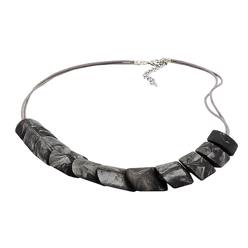 Dekoratives Modeschmuck-Collier mit einem Mustersatz aus 20x15mm großen Schrägperlen aus Kunststoff, schwarz-silbergrau-marmoriert-matt, die sich wie Schuppen ineinander fügen, aufgezogen auf zwei lüstrierte (gewachste) hellgraue 0,6mm-Baumwollkordeln mit silberfarbenem Karabiner-Verschluss plus Verlängerungskettchen aus eloxiertem Aluminium. Der dunkle Farbton passt zu allen gedeckten Winterfarben. Alle Bestandteile dieser Modeschmuck-Kette wurden in Deutschland produziert und die Kette selbst in Handarbeit - made in germany - fertiggestellt.