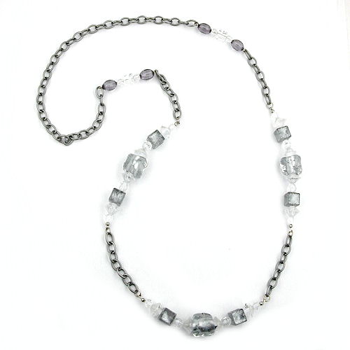 elegantes Mode-Collier mit verschiedenen Kunststoffperlen in transparent-facettiert, verspiegelt und silber-tönen, teilweise verbunden mit Ankerkette aus Aluminium in silber-hell, in Deutschland gefertigte Handarbeit