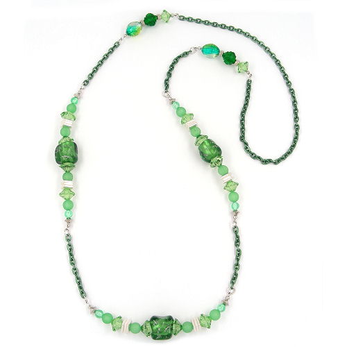 tolles Mode-Collier mit verschiedenen Kunststoffperlen in grün-transparent, facettiert, verspiegelt und silber-tönen, teilweise verbunden mit Ankerkette aus Aluminium grün-matt, in Deutschland gefertigte Handarbeit