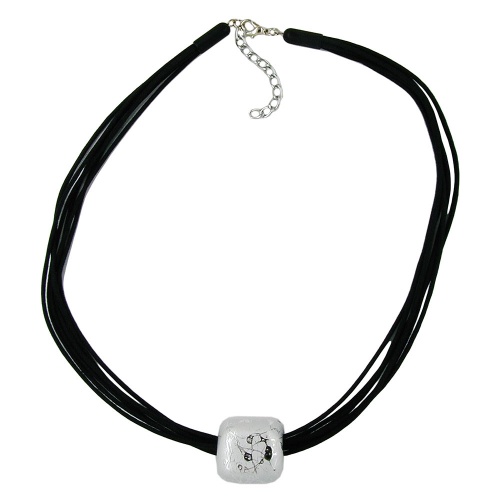 zeitloses Collier mit Kunststoff-Perle 34x23mm Oberfläche galvanisch silber-matt mit aufgespritzten Silberfäden an 6-fach Kordel schwarz, Verschluss silber-farbig mit Verlängerungskettchen, in Deutschland gefertigte Handarbeit