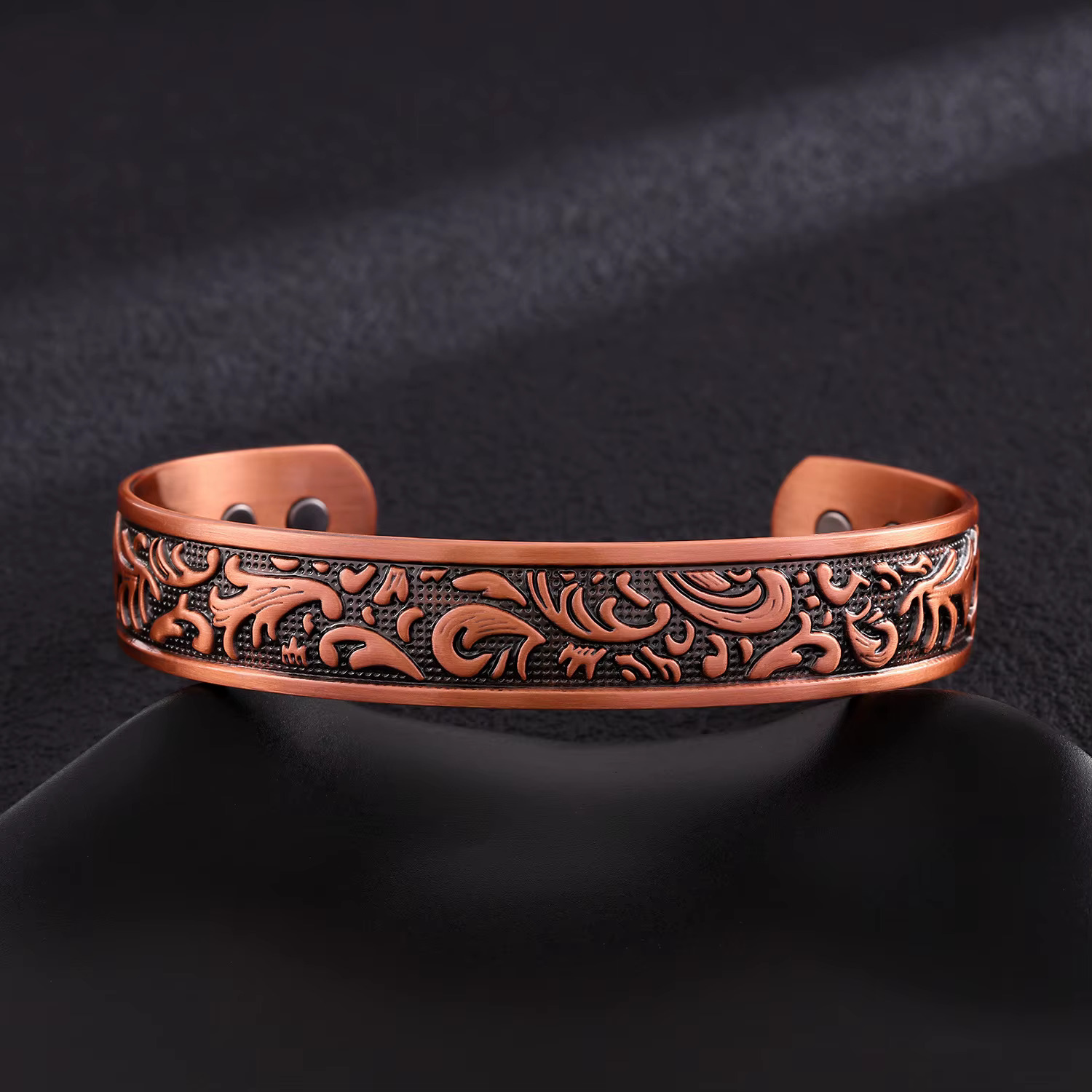Ein detailreiches Kupferarmband mit fließenden, nordisch inspirierten Ornamenten. Die geschwungenen Formen verleihen dem Schmuckstück Dynamik und Ausdruck – kraftvoll, lebendig und zugleich harmonisch.