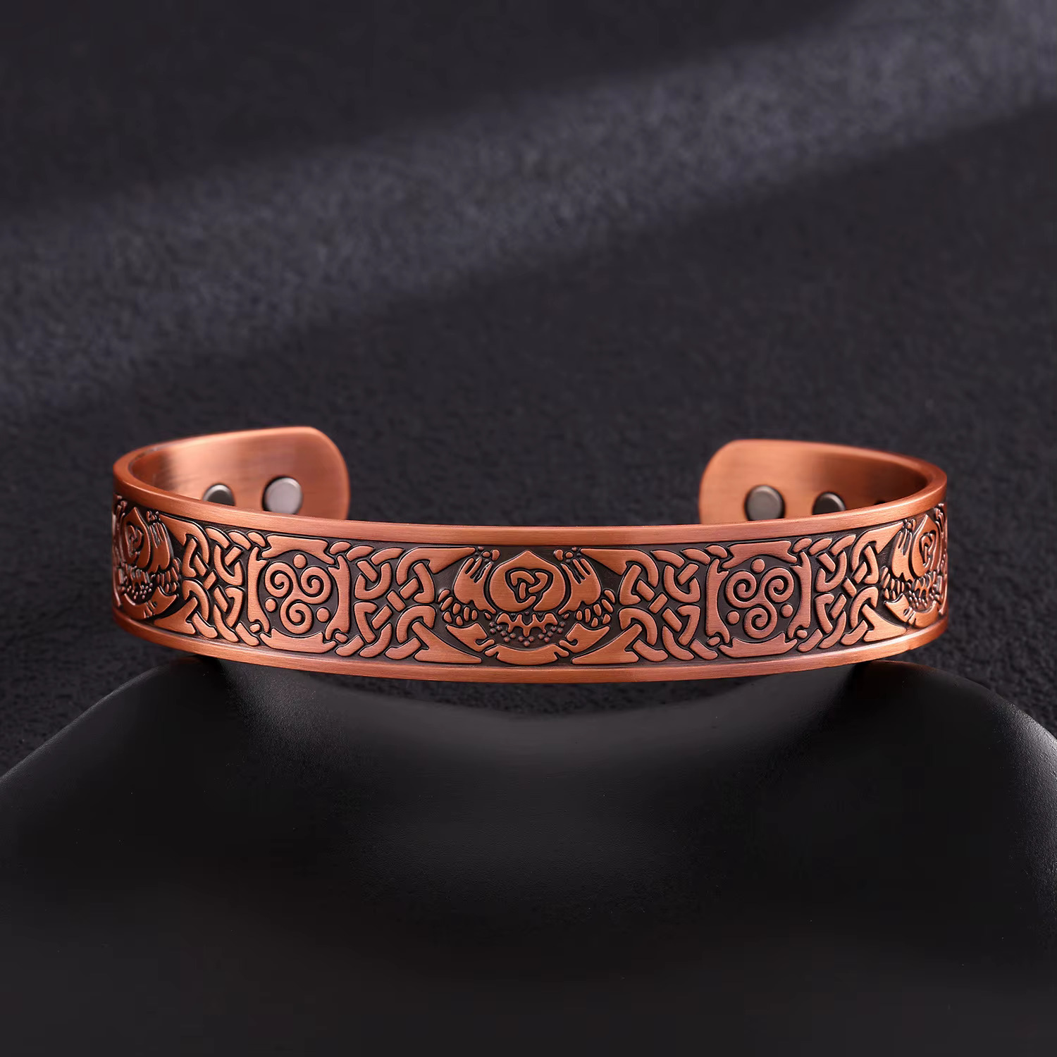 Ein ausdrucksstarkes Kupferarmband mit detailreichem, nordisch inspiriertem Motiv. Die zentrale Symbolik steht für Schutz, Wachsamkeit und innere Stabilität – kraftvoll gestaltet und dennoch harmonisch im Gesamtbild.