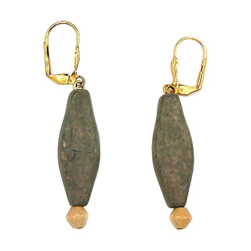 Diese leichten Modeschmuck-Ohrringe mit Klappbügel setzen den passenden i-Punkt zu dem Naturtrend in Ihrer Kleidung. Der Ohrhänger besteht aus einem Pendel mit einer flachen 31x12mm großen, grau-schlammfarbenen Kunststoffperle in Trapezform und zwei kleinen eckigen 6mm-Holzperlen in natur-hell, befestigt an einer goldfarbenen Ohrbrisur aus Messing, Gesamtlänge: 57mm. Alle Bestandteile des Ohrschmucks wurden in Deutschland produziert und in Handarbeit - made in germany - fertiggestellt. Verkauf paarweise.