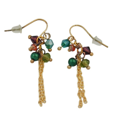 Verspielte multicolor-Modeschmuck-Ohrringe mit kleinen braunen, türkisfarbenen, grünen gekettelten Glasperlen, aus deren Bündel zwei dünne goldfarbene Erbskettchen herausbaumeln. Das Chandelier Ohrpendel ist an einem goldfarbenen Ohrhaken befestigt, Gesamtlänge mit Haken 45mm. Ohrschmuck betont zusätzlich das Gesicht und rundet Ihren Auftritt glanzvoll ab. Verkauf paarweise.