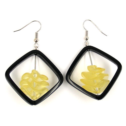 Diese leichten, auffallend großen Modeschmuck-Ohrringe mit der beweglichen, gelb-transparenten Spiralperle in der Mitte eines schwarzen Vierecks sind ein echter Blickfang. Der modische gelb-schwarz-Kontrast setzt zusätzliche Akzente und bringt Schwung in ein einfarbiges Outfit. Der Ohrhänger besteht aus einem schwarz-glänzenden, 32x32mm großen, quadratischen Rahmen aus Kunststoff, in dem sich eine wunderschöne, 20mm große, hochwertige Kunststoffperle auf einem Nietstift senkrecht frei bewegen kann. Der silberfarbene Ohrhaken aus Messing (Weißbronze) ist an einer Ecke befestigt, die Gesamtlänge des Ohrrings beträgt ca. 60mm. Alle Bestandteile des Ohrschmucks wurden in Deutschland produziert und in Handarbeit - made in germany - fertiggestellt. Verkauf paarweise.