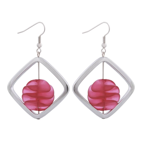 Diese leichten dekorativen Modeschmuck-Ohrringe mit der beweglichen Spiralperle in einem Lila-Beeren-Farbton in der Mitte eines Vierecks sind ein echter Blickfang. Der Ohrhänger besteht aus einem silber-glänzenden, 32x32mm großen, quadratischen Rahmen aus Kunststoff, in dem sich eine wunderschöne, 20mm große Perle aus hochwertigem Kunststoff auf einem Nietstift senkrecht frei bewegen kann. Der silberfarbene Ohrhaken aus Messing (Weißbronze) ist an einer Ecke befestigt, die Gesamtlänge beträgt 58mm. Alle Bestandteile des Ohrschmucks wurden in Deutschland produziert und in Handarbeit - made in germany - fertiggestellt. Verkauf paarweise.