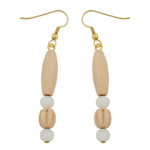 Diese federleichten Modeschmuck-Ohrringe setzen den passenden i-Punkt zu dem Naturtrend in Ihrer Kleidung. Der Ohrhänger besteht aus einem Pendel mit zwei hellen beigefarbenen Holzperlen und zwei weiß-seidenmatten 6mm-Rundperlen aus Kunststoff, befestigt an einem goldfarbenen Ohrhaken aus Messing. Alle Bestandteile des Ohrschmucks wurden in Deutschland produziert und in Handarbeit - made in germany - fertiggestellt. Verkauf paarweise.